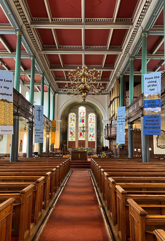 As we started back to the subway station, a violent fight erupted between some young men at the entrance to the station. Instead of fighting our way through, we walked up the street to Trafalgar Square where I noticed another church, St. Martin-in-the-Fields. This church is famed for its acoustics; many concerts have been recorded there making it world renowned. Jim first learned about the church while typesetting concert programs for our business, First Impression Graphics. He was really curious to see it, so we entered and discovered an a cappella choral performance had just begun. We sat in a back pew and enjoyed a really special performance by six amazing singers in a magnificent small church. Jim was delighted with this unexpected event, a true “lagniappe”—one of his London highlights.