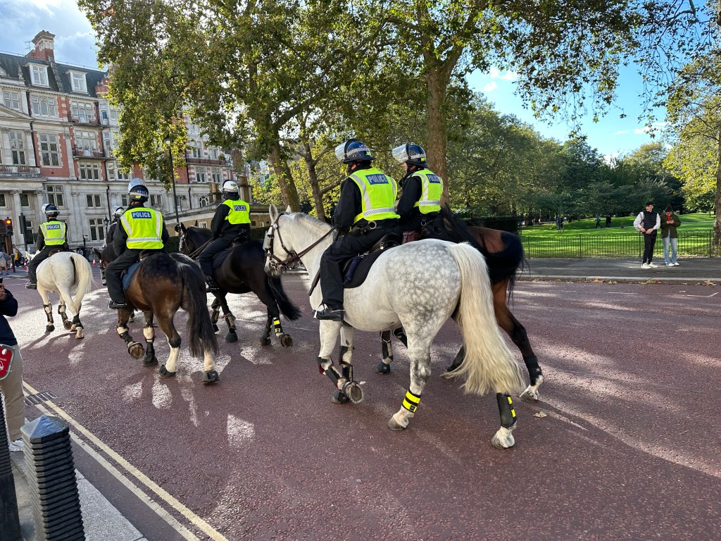 We passed a long row of paddy wagons and police on horses along Whitehall Street and Horse Guard Road—backups in case of trouble. As far as we could tell from the news, there was no trouble beyond random skirmishes.