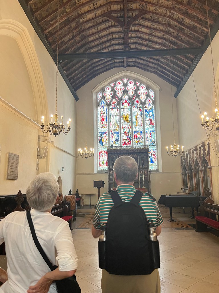 A flash shower started just as we arrived and ushered us back into the station for lunch. The Wetherspoon chair restaurant was busy. They have instructions to use their app for ordering, but it did not work so Becky went to the kiosk to order. My salad came quickly, hers not until she called attention to her lack of food. When the rain subsided, we began the 10 minute walk up and down hills to the Holiday Inn Express.